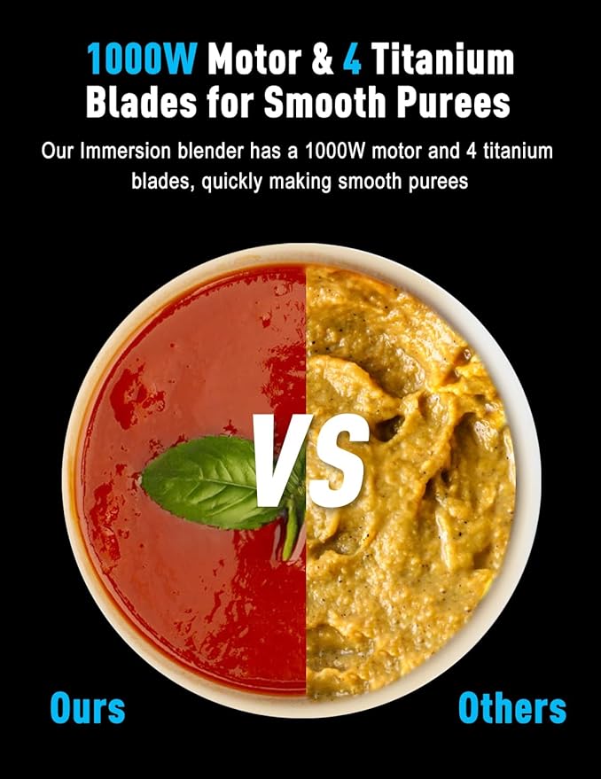 - 【1000W High-Power Motor】Our 2025 Immersion Blender, powered by a 1000W pure copper brushless motor, effortlessly crushes even the toughest ingredients. Designed for power and durability, it ensures smooth, consistent results with every use.