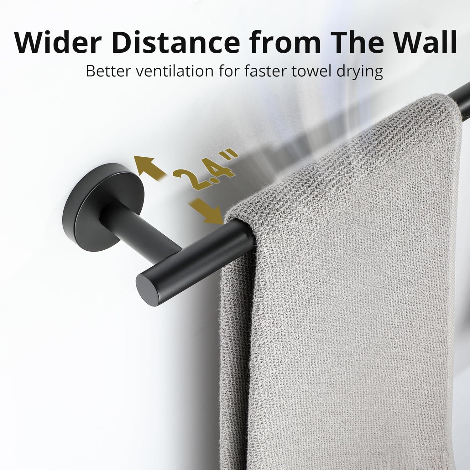 - 24 Inch Usable Length: The overall size of towel bar for bathroom wall is 26"L x 3.15"D x 1.98"H. The length of hanging space is 24 inch. 2.38 inch apart from the wall for quick & thorough air drying.