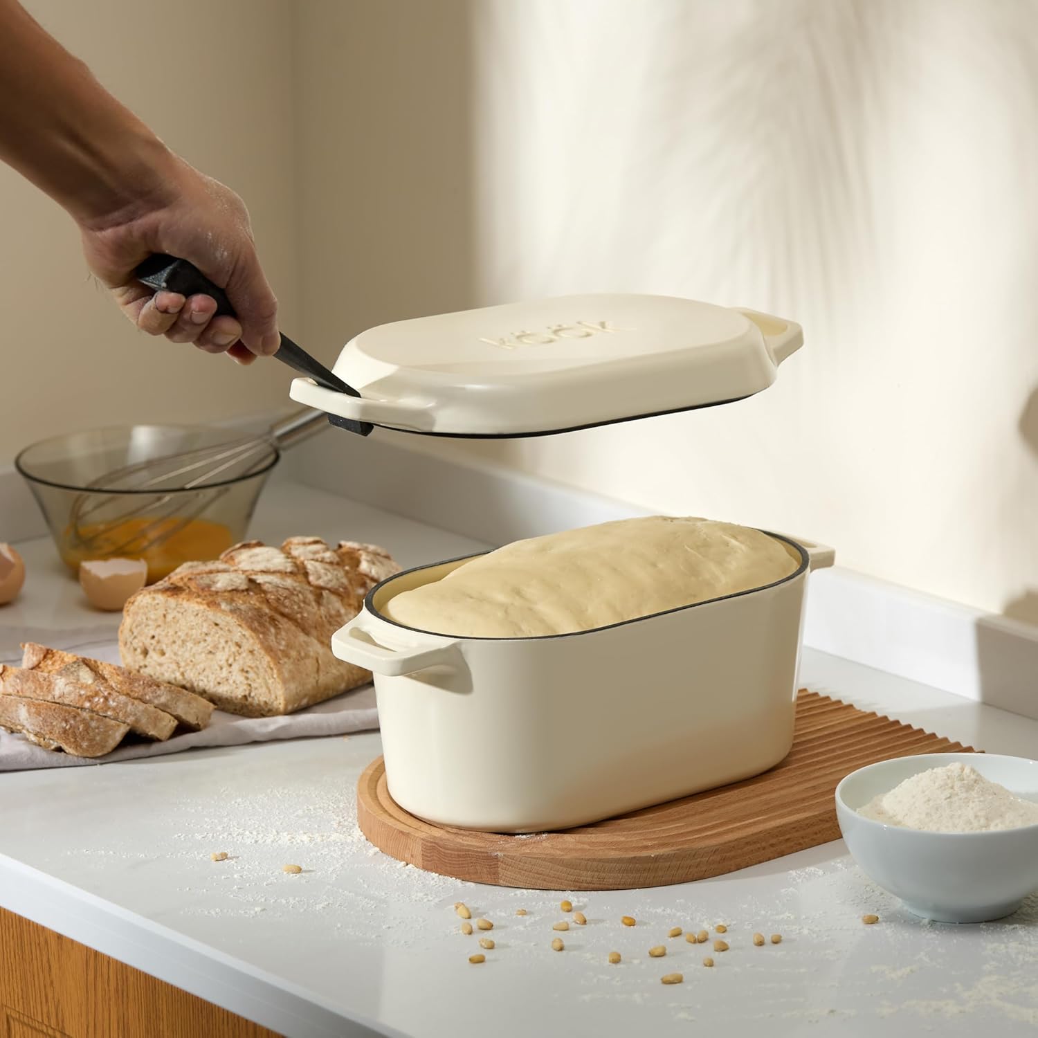KooK Dutch Oven with Lid, Dual Handles, Enameled Cast Iron, includes Lid Lever, Great for Baking Bread, Cooking and Roasting, Dishwasher Safe, 3.4 Qt, Ivory
