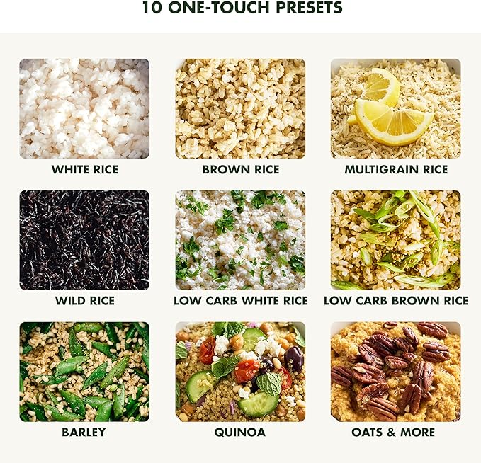 - 10 ONE-TOUCH PRESETS: White Rice, Brown Rice, Multigrain, Wild Rice, Low Carb White Rice, Low Carb Brown Rice, Barley, Quinoa, Beans, and Steel Cut Oats.