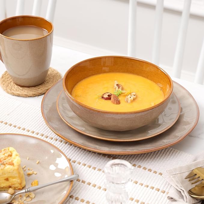 vicrays Ceramic Salad Bowls Set for Kitchen, Serving - 32 Ounce Soup Bowls, Pasta Bowls, Chip Resistant, Dishwasher Microwave Safe, Large, Fluted, stoneware, Set of 6 (Beige)
