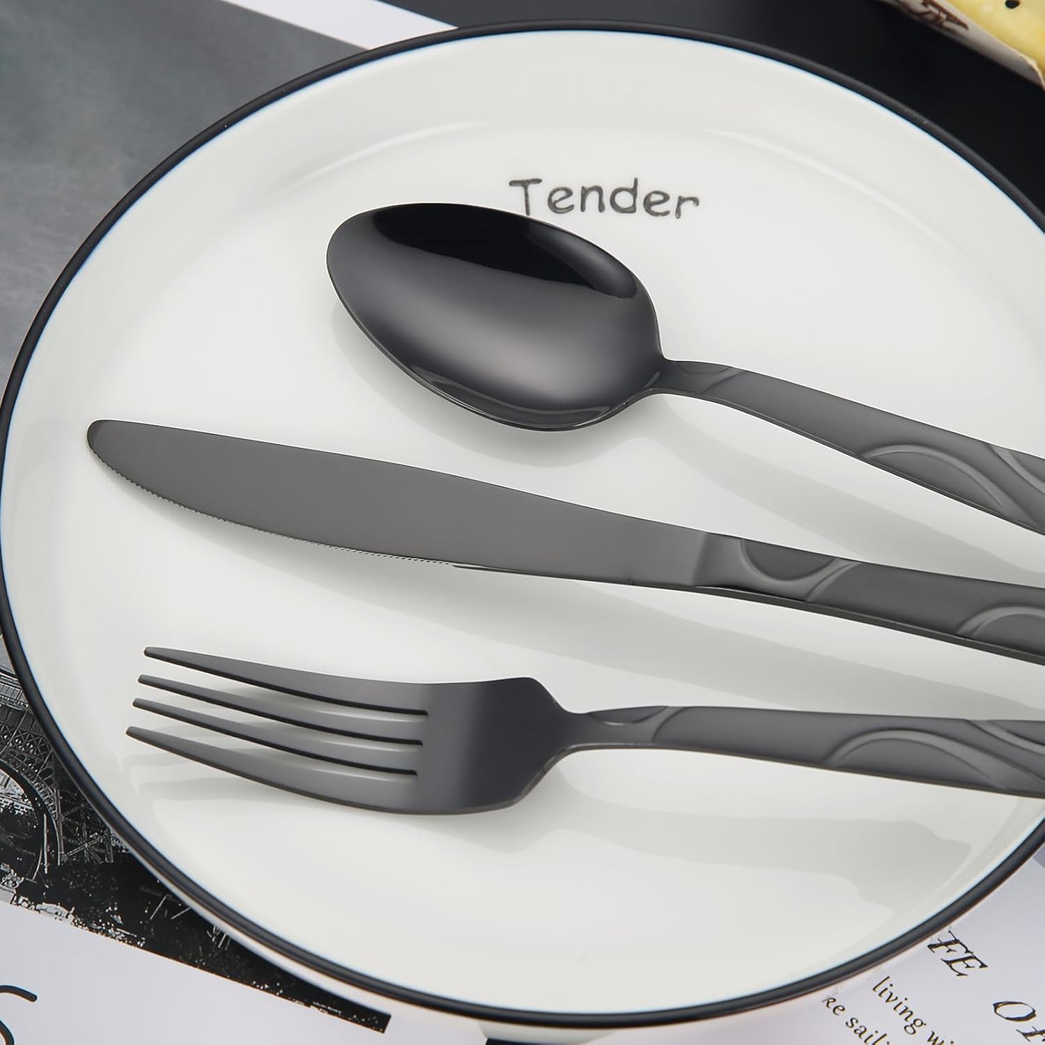 - 30 Pieces for Complete Service: This Black Silverware Set includes service for 6, featuring 6 dinner forks, 6 dinner spoons, 6 salad forks, and 6 knives. Each piece in this stainless steel flatware set is designed to meet all your dining needs, whether you’re hosting a dinner party or enjoying a family meal.