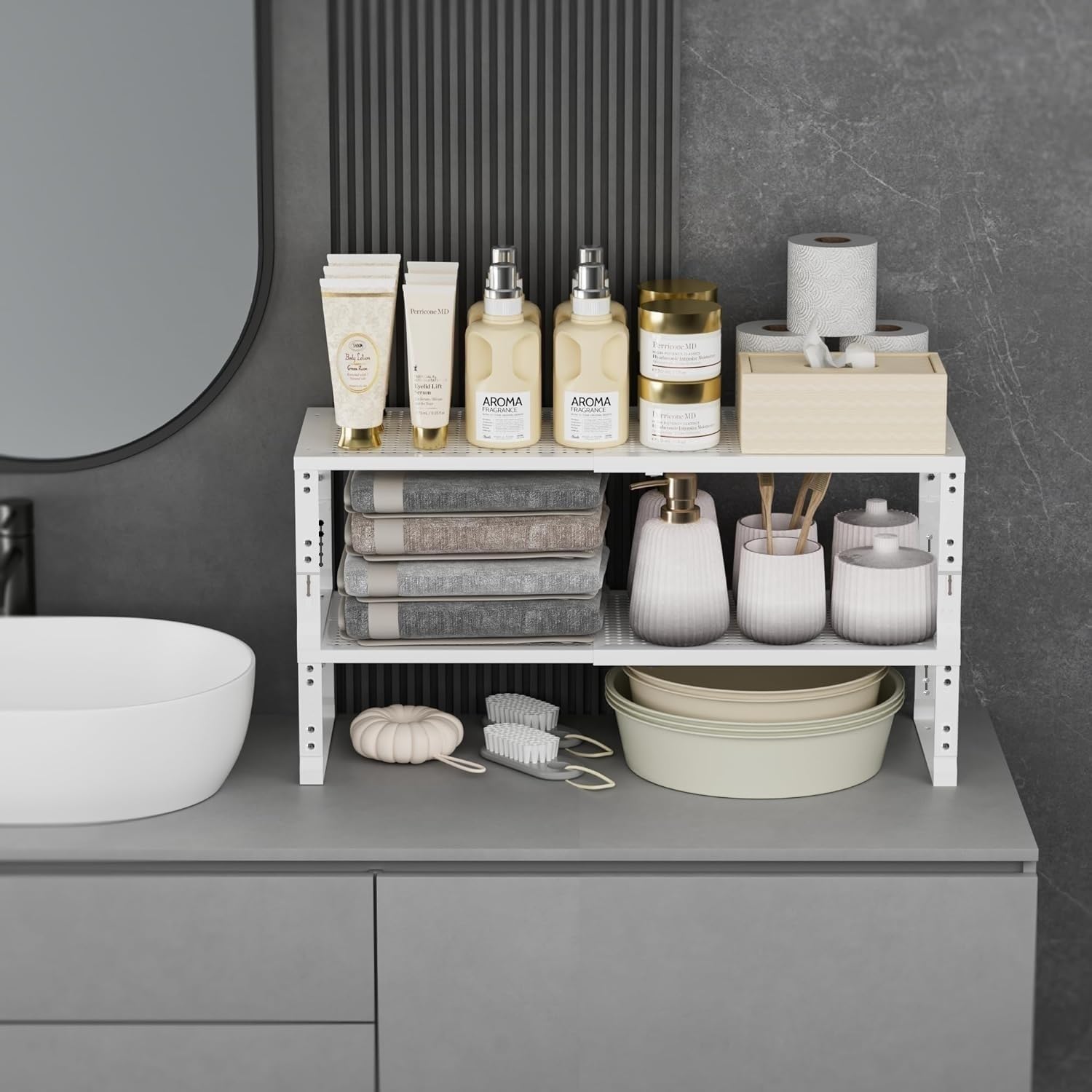 - āćExpandable,StackablećThe shelves can easily expand and contract according to your storage needs, whether it is kitchen clutter or office supplies.You can combine multiple shelves together to form a large storage system, or separate them into several separate smaller units(Measureļ¼10.24"D x 16.54"W~27.17"W x 8.31"H/7.68"H/7.05"H/6.42"H)