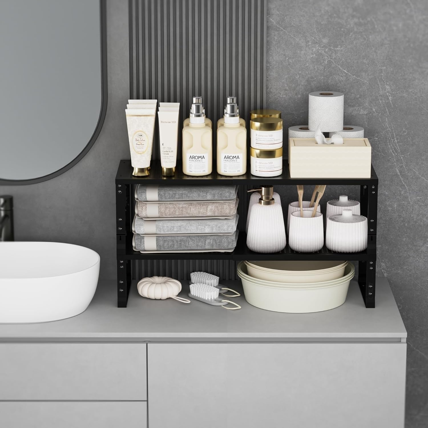- āćExpandable,StackablećThe shelves can easily expand and contract according to your storage needs, whether it is kitchen clutter or office supplies.You can combine multiple shelves together to form a large storage system, or separate them into several separate smaller units(Measureļ¼8.11"D x 16.54"W~27.17"W x 8.31"H/7.68"H/7.05"H/6.42"H)