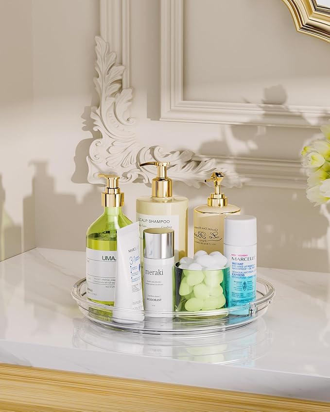 - Thoughtful Design: LAMU clear Lazy Susan pantry organizer features a specially designed 1.38'' raised edge to prevent items from falling during rotation. The clear design seamlessly blends with any decor, keeps it tidy and enhances the aesthetic appeal