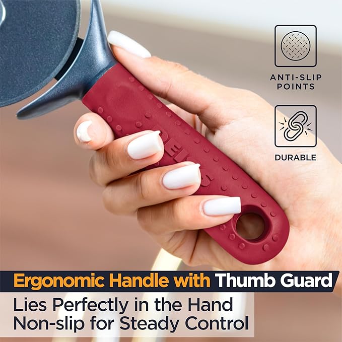 - ✅ERGONOMIC DESIGN, COMFORTABLE GRIP - The circular saw pizza cutter has a non-slip handle with a rubber grip that feels good against your hand without being squishy or slippery when wet. Easy fit for all hand sizes and a perfect choice for people with Arthritic hands. The built-in finger guard protects your hands from both the pizza cutter stainless steel blade and the heat.