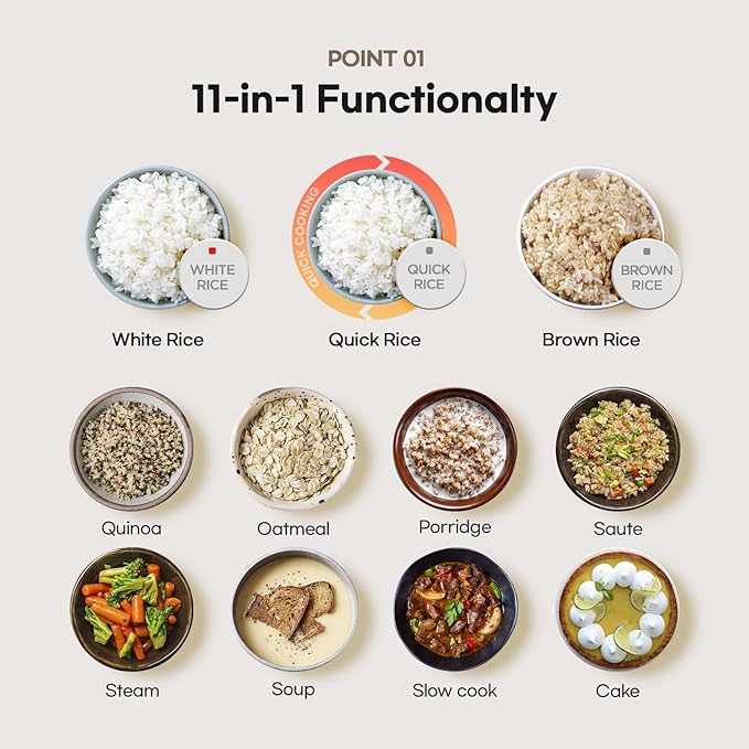 - 11 PROGRAMS: White Rice, Quick Rice, Brown Rice, Quinoa, Oatmeal, Porridge, Saute, Steam, Soup, Slow Cook, Cake, Enable You to Easily Prepare a Wide Variety of Dishes