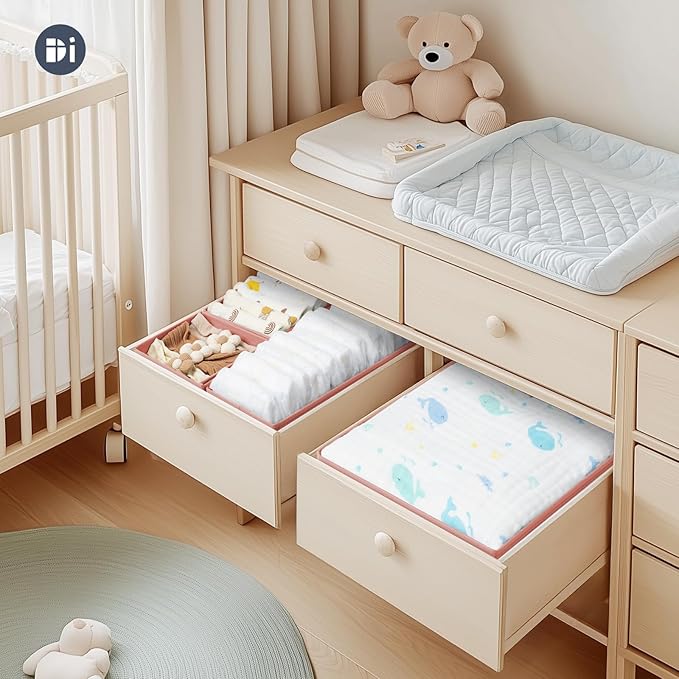 - [ Long-Lasting Quality] : Our dresser organizer are crafted from tough, breathable non-woven fabric with superior stitching, ensuring durability for years to come. The heavy boards added at the sides and bottom provide additional support, making these drawer organizer both sturdy and odorless—perfect for storing baby clothes or other delicate items.
