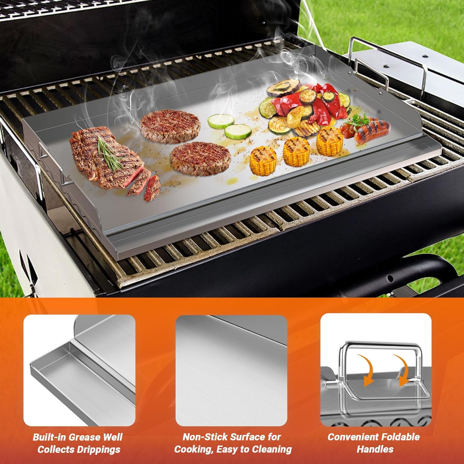 - Premium Stainless Steel Construction: The universal stainless steel griddle is made from extra-thick, heavy-duty stainless steel for easy cleaning. (Ensure to season before use to prevent sticking)