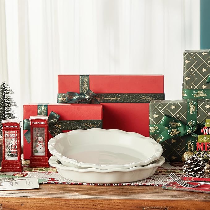 Lareina Ceramic Pie Pans for Baking, 9 Inches Pie Plate for Apple Pie, 36 Ounce Round Baking Dish, Set of 2, Thanksgiving day Gifts for Women, White