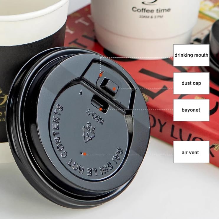 - Leak-Resistant and Durable β The black lids form a secure seal with the 12oz paper coffee cups, preventing leaks and spills while maintaining the temperature of your favorite drinks