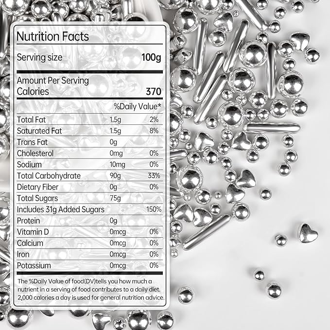 - Silver Pearl Rods Heart Sprinkles are a delightful addition to your baking and decorating collection. Net Weight: 150g/5.29oz. They are free of gluten, nuts, preservatives, dairy products, and any harmful chemicals.