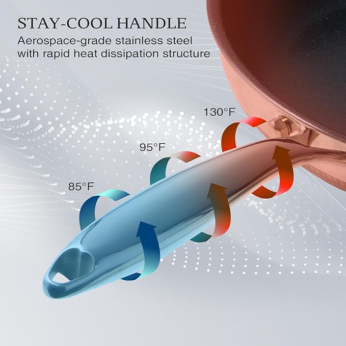 - 5-Layer Structure : The stainless steel frying pan features a nonstick titanium ceramic interior, a 4mm extra-thick aluminum core, and a dual-layer 403 stainless steel design, ensuring rapid and even heat distribution along with outstanding durability. The outer star-trail etched layer prevents yellowing caused by flames and stains. Its five-layer structure locks in heat, preserving flavors and textures for an exceptional cooking experience.
