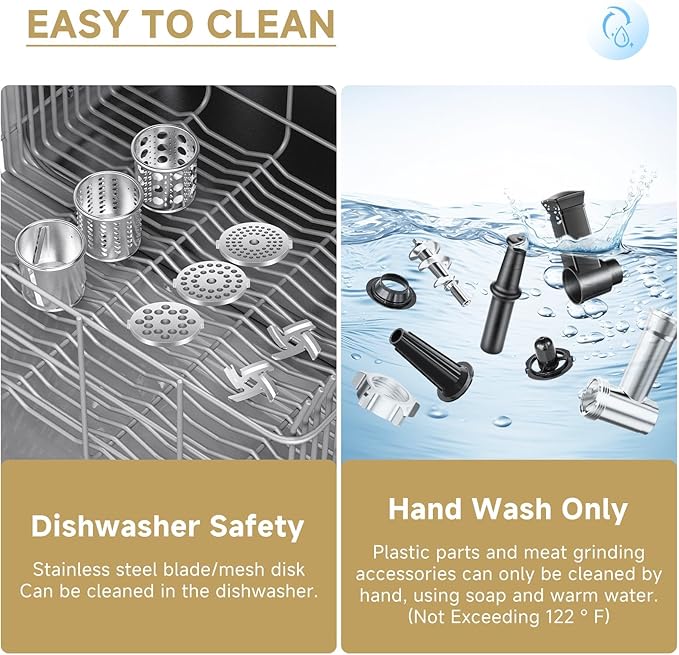 - Included:3 S/S plates,2 S/S blades,1 sausage stuffer, kubbe maker,3 slicing/ shredding/ grinding blades.All parts can be disassembled for hand wash, Hand wash and wipe with a cloth to prevent oxidation of alloy parts. Dishwasher-safe blades and plates