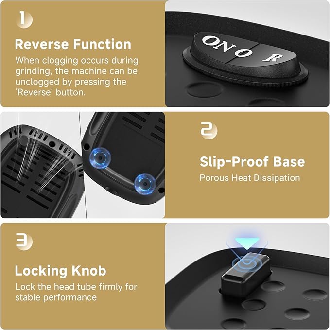 - Safe & Thoughtful Design: The locking knob and overload protection provide safety for use. With a thermostat system, an automatic built-in circuit breaker for protection can prevent the motor from overheating.Press the “Reverse” button feature for unclogging the machine.Tip: Avoid grinding meat with bones,tendons, or skin to prevent from jamming