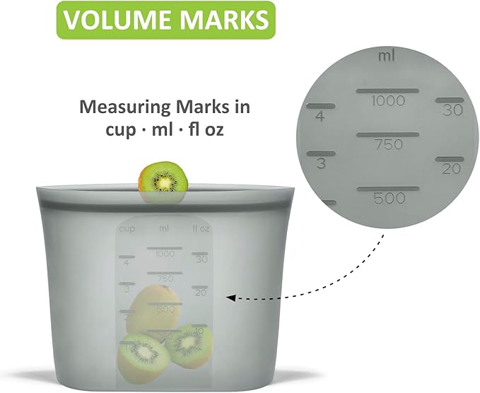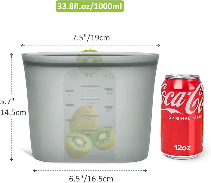 - 【THOUGHTFUL & ECONOMICAL】Small size: 33.8fl.oz/1000ml. These reusabe sandwich bags come with clearly volume marks in cups, milliliters and fluid ounces for easy use. The translucent grey body helps to get a glimpse of what's inside, though not in crystal clear detail. Plus, One silicone bag can reduce up to 300+ single-use plastic bags a year, helping to create a waste-free world and save you a bundle