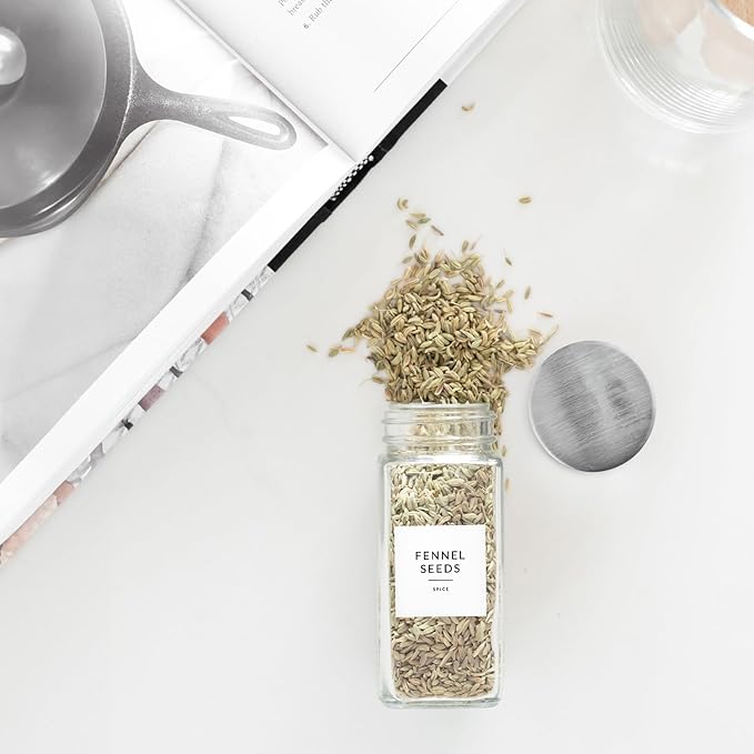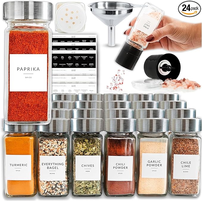 - SHAKE & BAKE - Glass Spice Jars with Shaker Lids (24pcs) makes cooking easy with versatile pouring or sifting of spices. Small Spice Jars with Lids allows spice storage jars to fit everywhere.