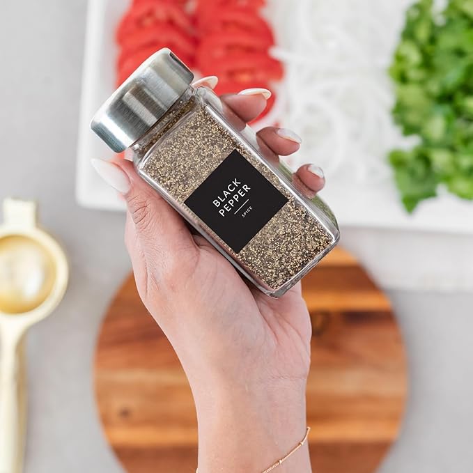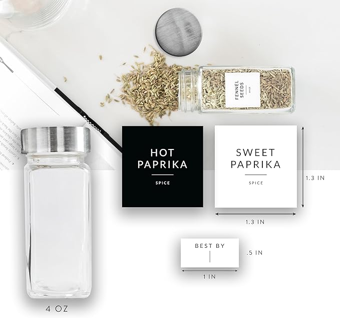 - 374 SPICE LABELS STICKERS - Complete Square Spice Jars Stickers Sets in Minimalist Labels design including a White Spice Labels, Black Labels, and 88 Food Date Expiration Labels to keep your Kitchen Organized and your Spices Fresh.