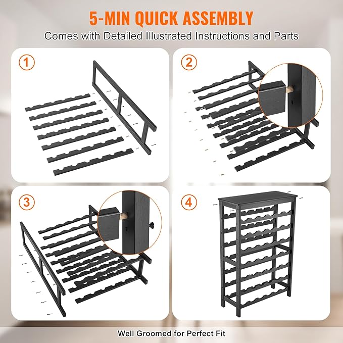 - Hassle-Free Assembly: Assembling our freestanding wine rack is a breeze. Simply follow the easy instructions to tighten the screws, and you can set up the rack immediately. If you need to move the rack, be sure to remove the bottles first.