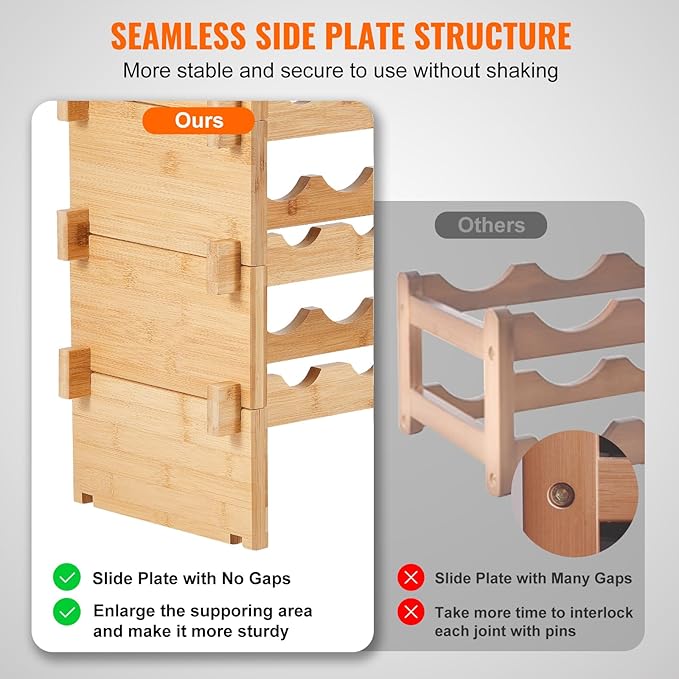 - Sturdy Construction: Our wood wine rack is very sturdy, with upgraded side panels that eliminate gaps and expand the support area. This design ensures the rack's stability, preventing wobbling, tilting, or falling, and providing excellent safety for your bottles over long-term use.