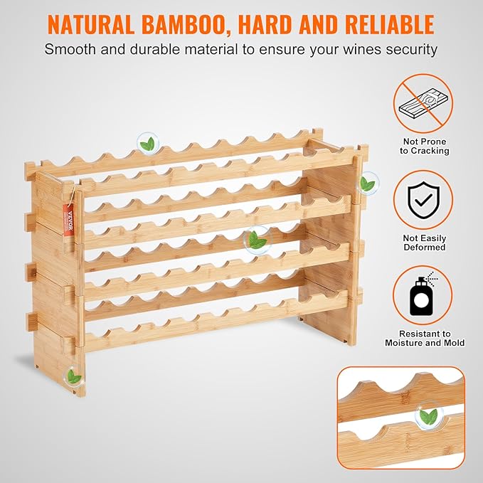 - Natural Bamboo Wood: Our wine storage rack is made from high-quality bamboo, which is smooth, crack-resistant, and less likely to absorb moisture or mold. The natural bamboo has excellent resilience and supports wine bottles perfectly without wobbling.