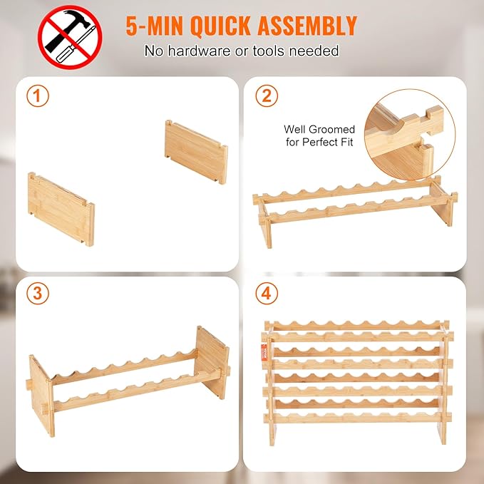 - Hassle-Free Assembly: Assembling our freestanding wine rack is a breeze, taking just 5 minutes with no tools, nails, or screws required. It's very simple, but please make sure to check that all parts are correctly aligned before assembly. You can also stack it to your preferred number of layers.