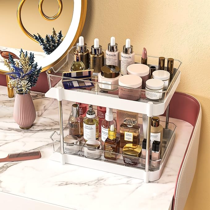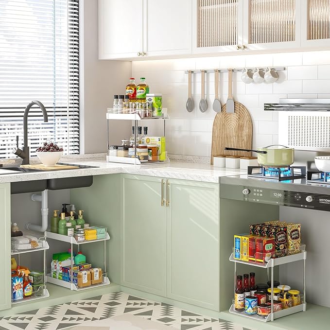 - Storage Space : White&Clear Under sink organizers and storage is spacious enough in two levels maximizes vertical space. The double tier sliding drawers can be pulled out by the handles for easy access to get items behind the front row. Effectively using the entire space of the cabinet.