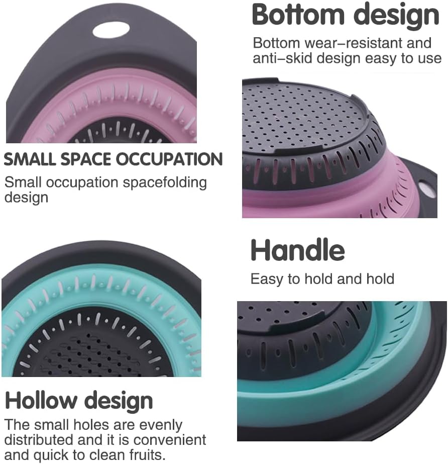 - 🍎FOLDABLE & SPACE SAVING – Ergonomic and space-saving design. The silicone folding strainers can be folded down to under 2 inch, save much space for your kitchen and convenient to store in kitchen drawer, cabinet or drying tray, even can be hung on hook. Perfect for small kitchen, camping, RV, travel trailer.