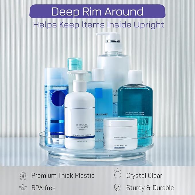 - [ Stable Structure ] - These clear rotating lazy susans are made of BPA-free plastic which are also crystal clear and sturdy. Hand wash recommended and dry completely.