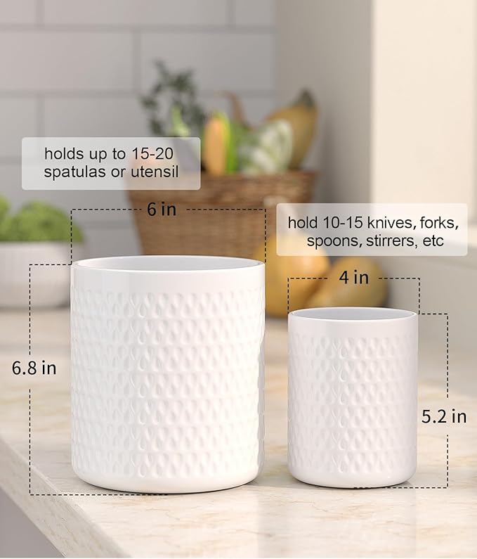 - 【Ceramic Utensil Holder Set Of 2】: This kitchen utensil holder set includes two utensil caddy, the larger size is 6" W x 6.8" H and holds up to 15-20 spatulas or utensil. The smaller size is 4" W x 5.2"H is ideal for holding smaller whisks and small spatulas, hold 5-12 knives, forks, spoons, stirrers, whisks, etc