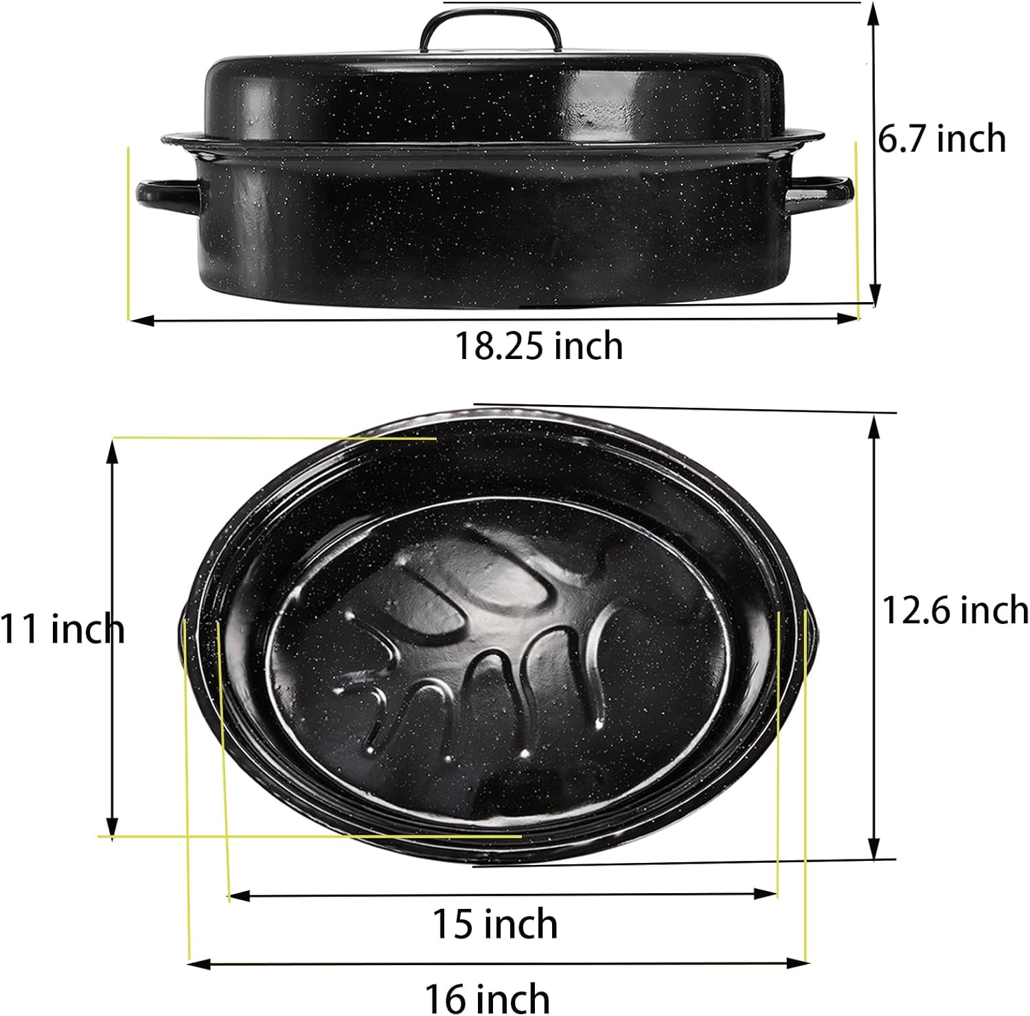 - The size of the oval roaster pan with lid : 18.25"(Length with handle)x 12.6"(W), inside size: 15"x 11", 6.7"(Height with Lid), big enough for roasting turkey, rib, ham, vegetable, brisket, cooking with lid holds under 15 lb bird, no lid holds max 18 lb