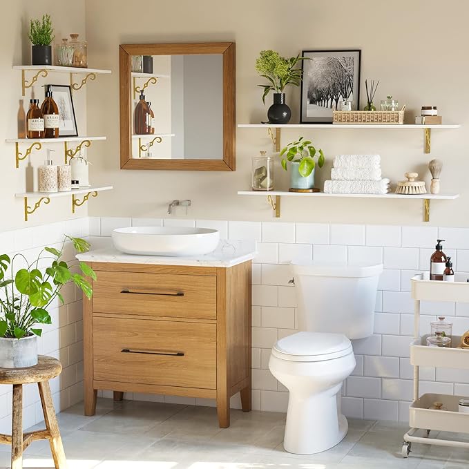 DINZI LVJ Long Wall Shelves, 31.5" Wall Mounted Shelves Set of 4, Wide Floating Shelf for Wall with Metal Brackets, for Living Room, Bathroom, Bedroom, Kitchen, Office, White and Gold