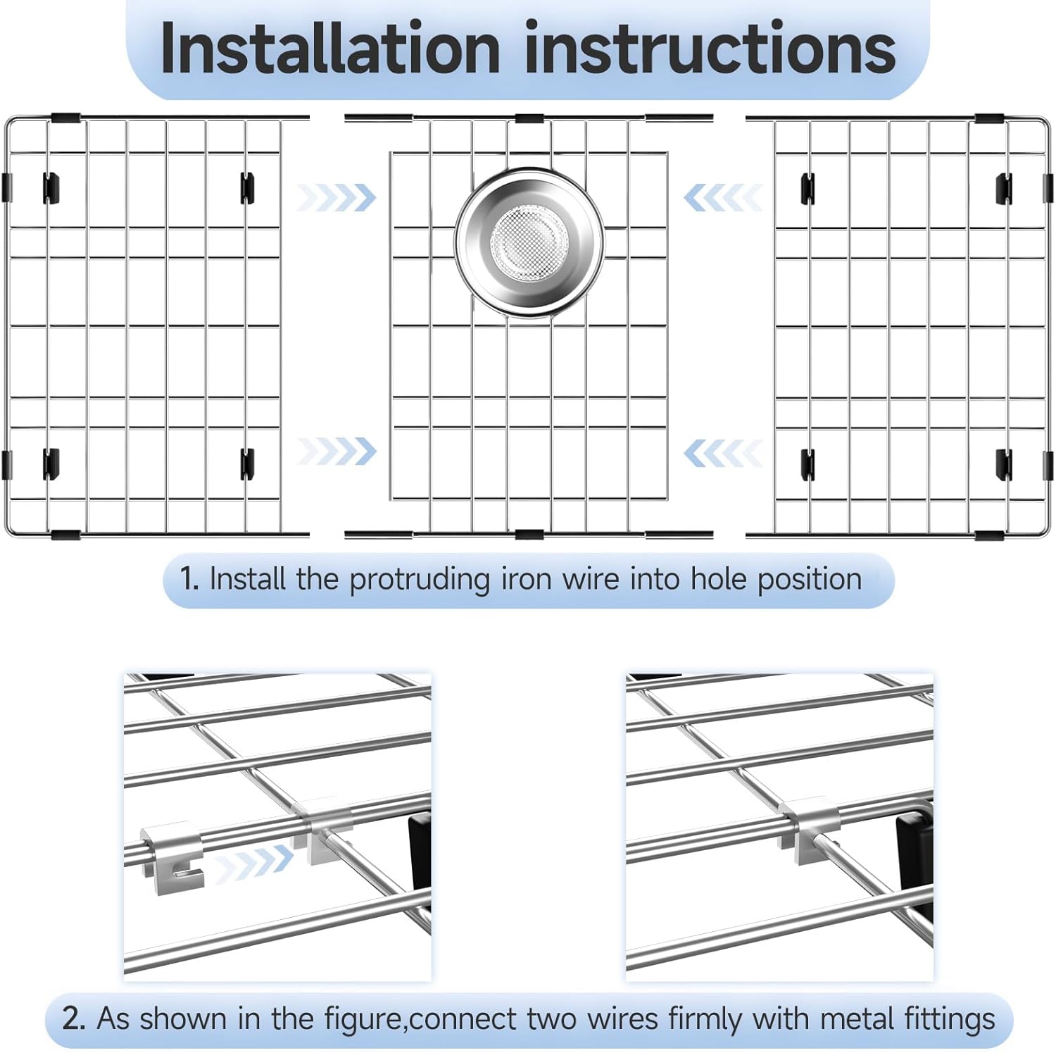 - Installation Method: The stainless steel sink protector is divided into three parts. You only need to put the buckle card into two flat nets to connect according to the instructions to easily get a solid and durable water sink protector