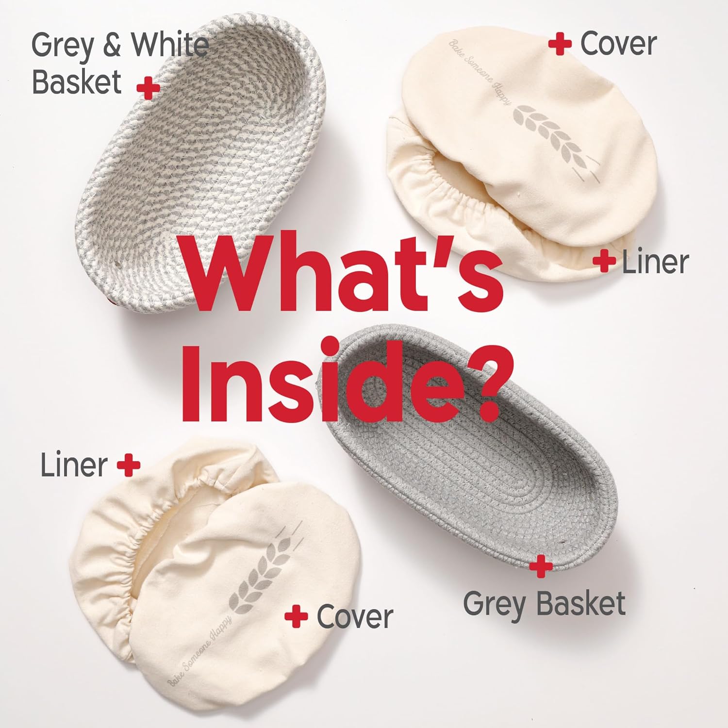 Cotton Rope Banneton Bread Proofing Basket Set, 2 x Oval Bread Basket with Liners & Covers for Artisan Bread Baking, Sourdough Bread Baking Supplies