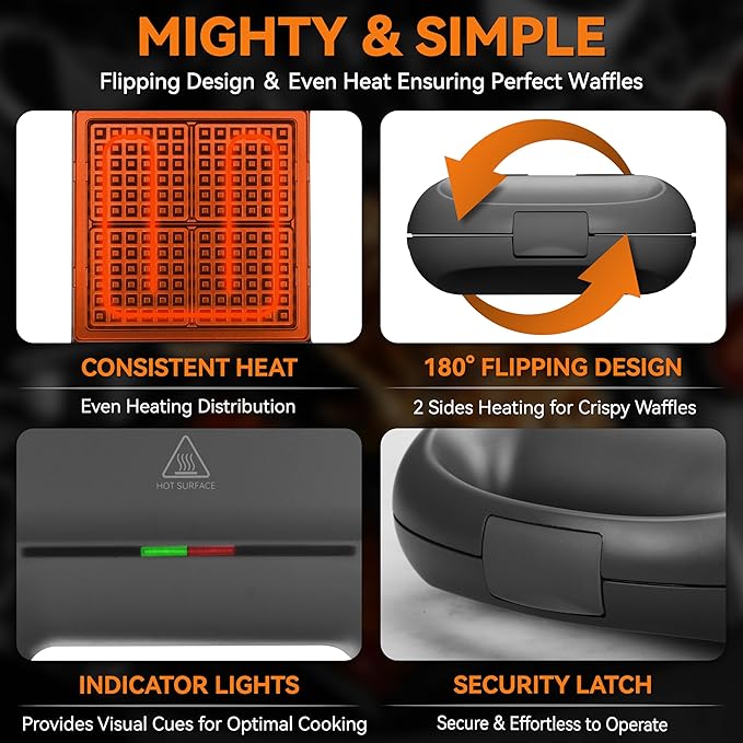 - [ABUNDANT & EXCEPTIONAL WAFFLES]: Equipped with a 180-degree flipping capability and reinforced baking plates, this Belgian waffle iron ensures impeccable heat distribution, delivering waffles that are delightfully crispy on the outside and tender on the inside – an absolute treat. With the ability to make 4 waffles simultaneously in just a few minutes, it boasts remarkable efficiency. Perfect for both individual enjoyment and large family gatherings.