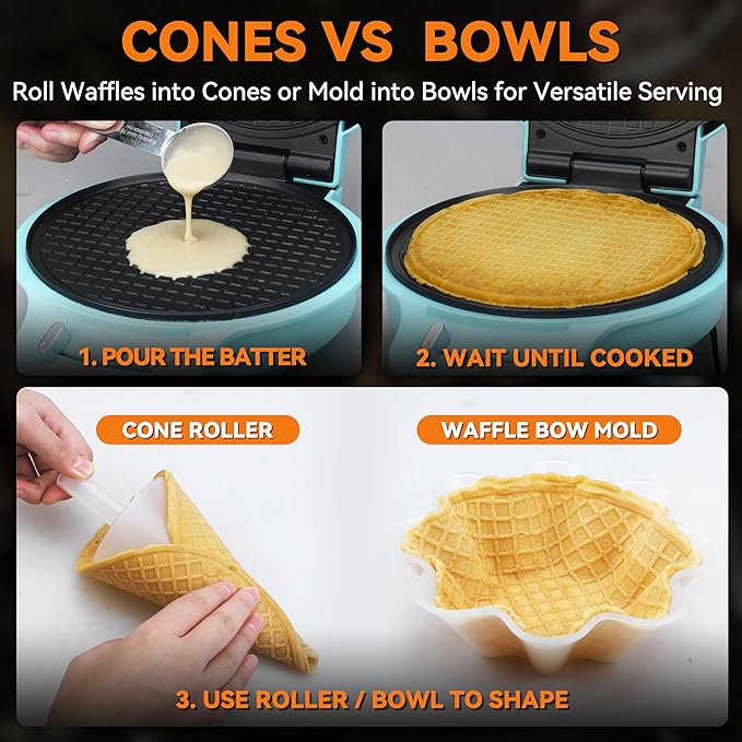 - [EXCLUSIVE DESIGN]: This versatile set includes both attachments, the waffle bowl and cone roller attachments that enabling you to create waffle cones and bowls perfect for scooping ice cream and other desserts. Especially, our ice cream waffle bowl boasts a distinctive panel design, featuring a corrugated bowl mold that without wrinkles.