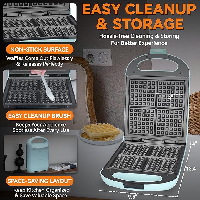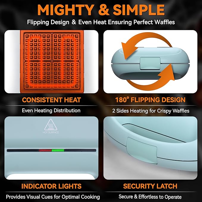 - [EFFORTLESS COOKING]: Featuring a front indicator light, this healthy & non toxic waffle maker eliminates guesswork by clearly signaling when it's preheated and ready for use, simplifying your breakfast routine. Additionally, the cool-touch handle ensures safe operation by preventing burns when opening the lid. Crafted with a high-quality nonstick surface, even heat distribution ensures perfect waffles every time while facilitating effortless cleanup.