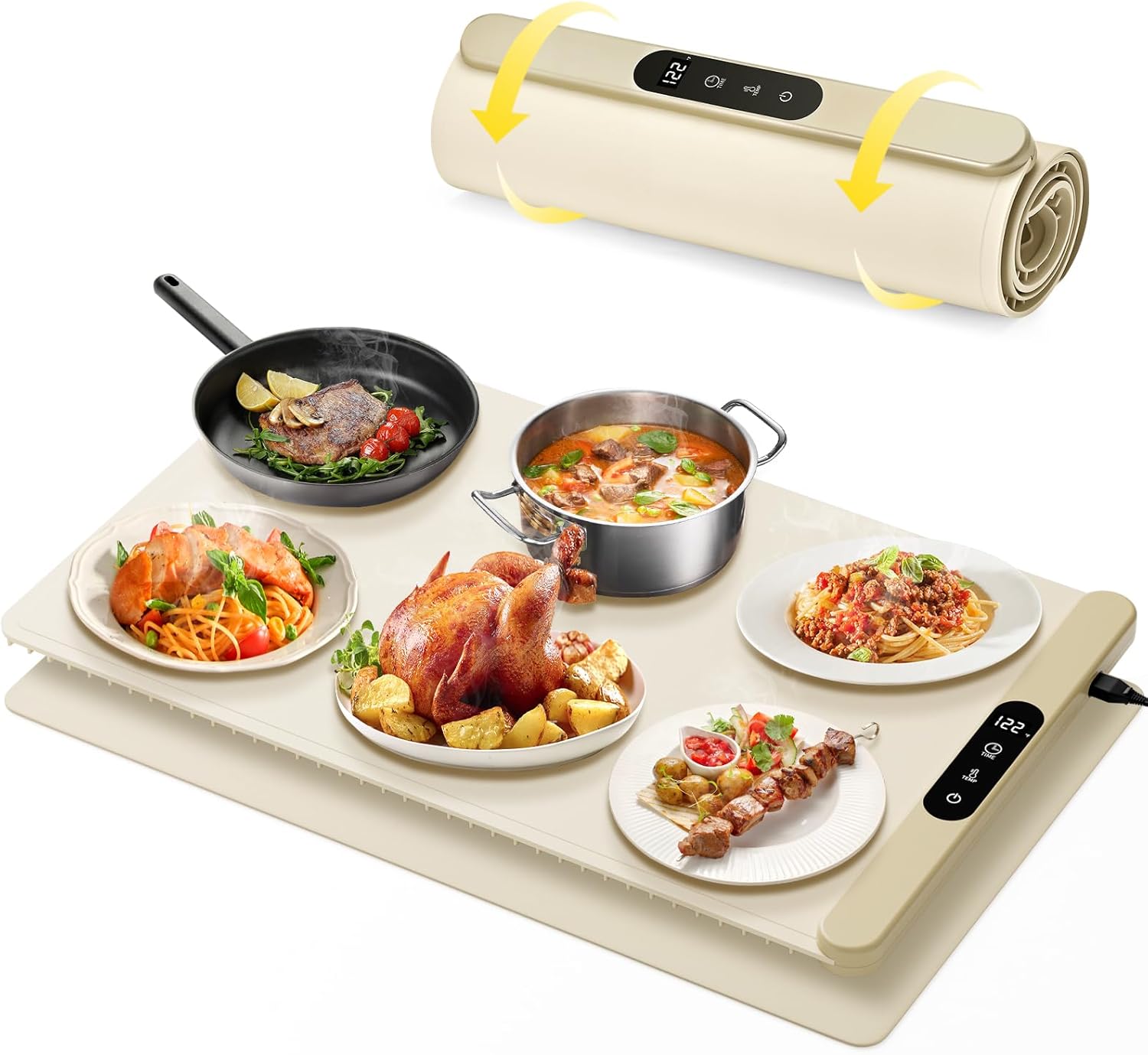 - 【Rollable & Super Easy-Clean】Store effortlessly! This flexible food warmer mat rolls smoothly without creases and fits in the included storage bag. The stain-resistant, food-grade silicone cleans in seconds - no scrubbing needed. A perfect portable food warmer for small kitchens!