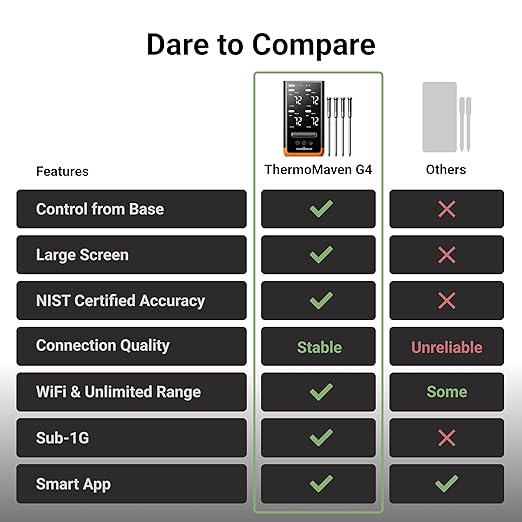 - Smart Display Base: Unlike other thermometers that require an app to function, the G4’s display base provides real-time readings and lets you set temperatures directly on the device. A smart app is also available, giving you the best of both worlds.