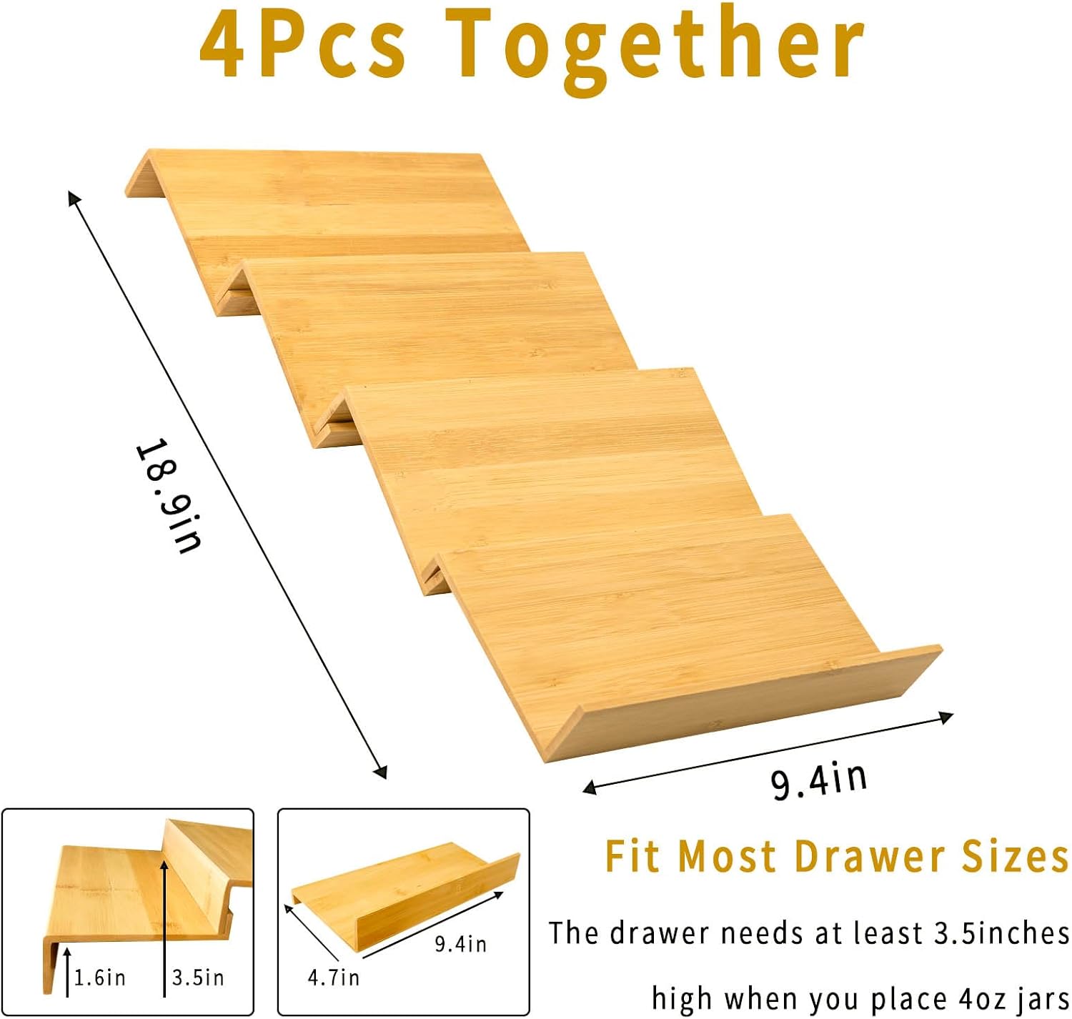 Bamboo Spice Rack For Drawer,4Pcs Tier Stackable Seasoning Storage Organizer Insert,for Kitchen Condiments Storage Insert(Jars Not Included,Combined Size:18.9" D x 9.5" W x 1.8" H)