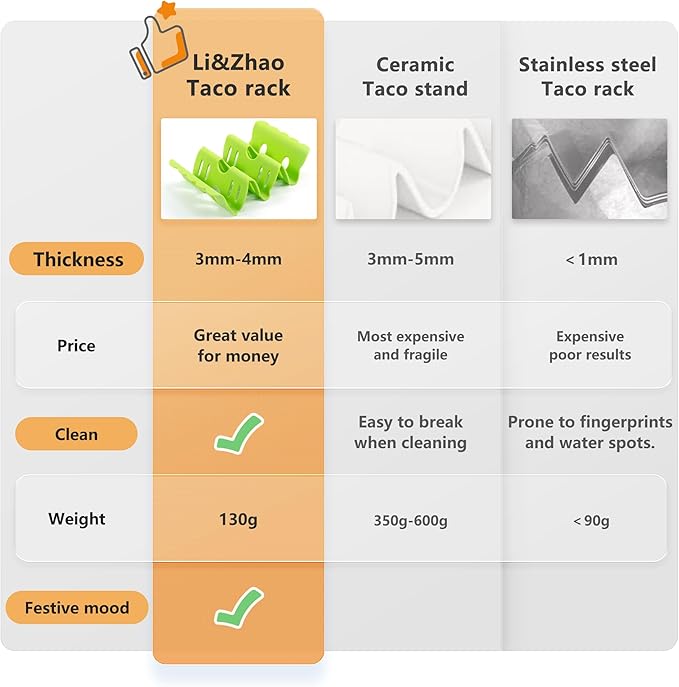 - Triangle Design: The taco holder stands have a curved design.The hollows at each fold make it easier for you to place or pick up tacos