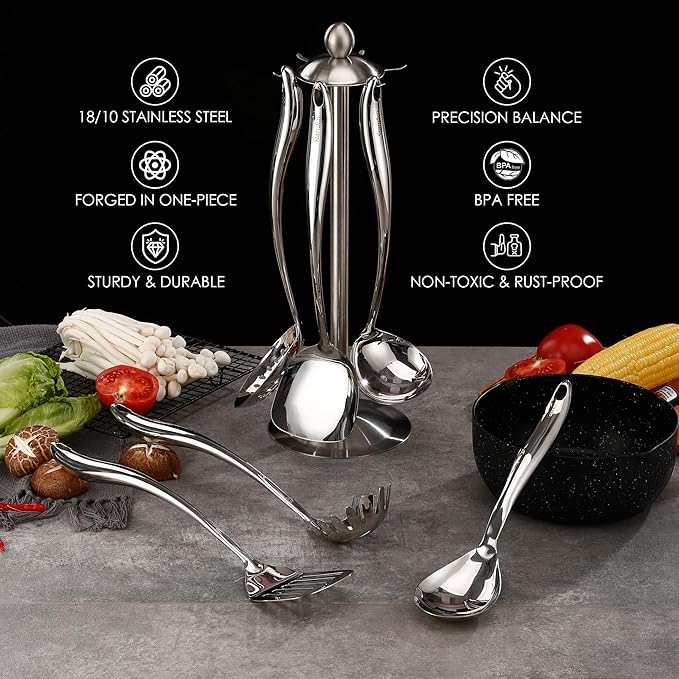 - 【High Quality Kitchen Utensils Set of 7】: Made of restaurant-quality 18/10 stainless steel(Highest grade in 304). Forged in one-piece, sturdy and durable. Fine mirror polished, shinning surface, unique shape and style