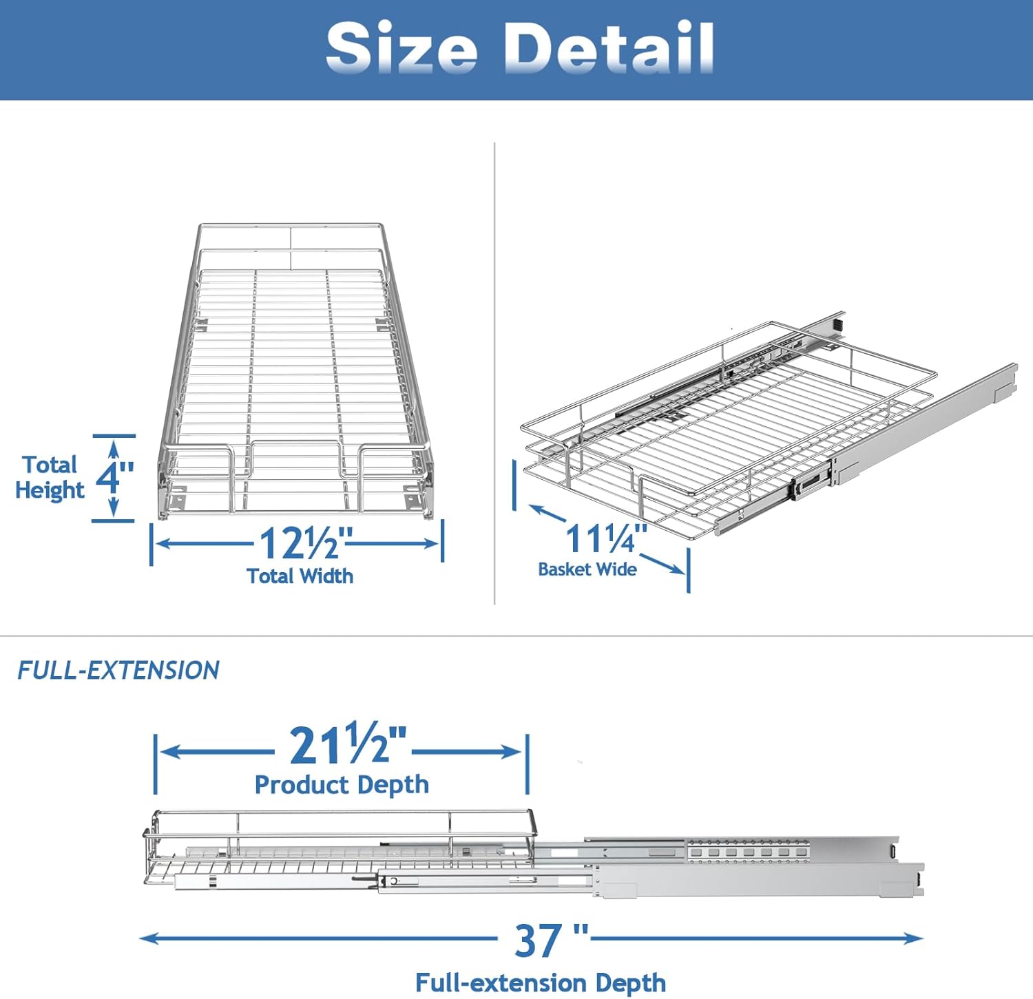 - 【Cabinet Pull Out Shelf Size】 This Kitchen organizer dimensions 12½"W x 21½"D x 4"H. Fits 13" cabinet openings and larger. ROOMTEC cabinet slide out shelves serves your needs for your kitchen, Bathroom, laundry and pantry storage organizing.