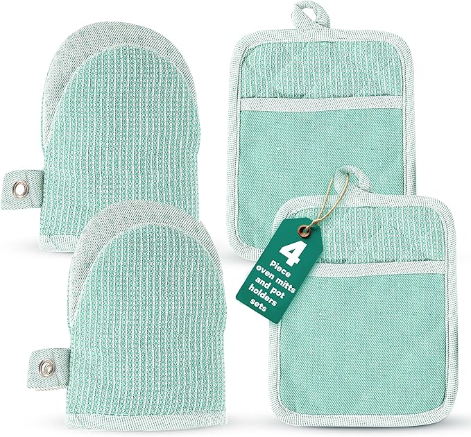 - 4-PIECE MINI OVEN MITT & POT HOLDER SET – This essential kitchen set includes 2 oven mitts (8" x 5.5") and 2 pot holders (7" x 8"), designed for safe handling of hot cookware. Perfect for baking, grilling gloves, BBQ, and kitchen use, these potholders for kitchens add both functionality and style.