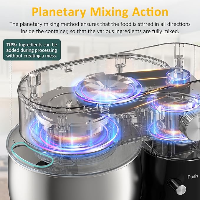 - 【Uniform And Thorough Mixing】Achieve thorough mixing with our stand mixer, featuring planetary mixing action that rotates attachments around the entire stainless steel bowl. Hands-free mixing, ensuring all ingredients are perfectly combined.