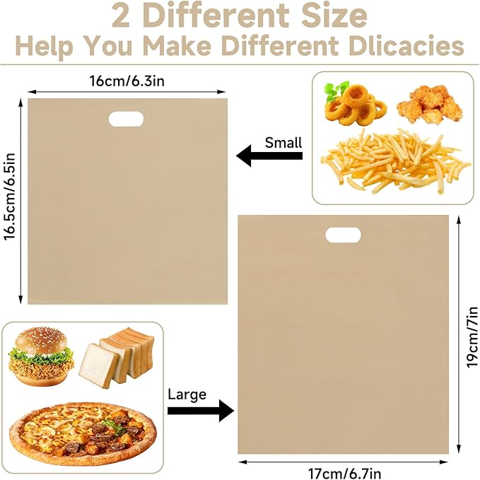 - 2 Different Size: 12 Pcs small toaster bags 6.3*6.5 Inch (16*16.5cm) and 12 Pcs large toaster bags 6.69*7.48 Inch (17*19cm), suit for most snacks