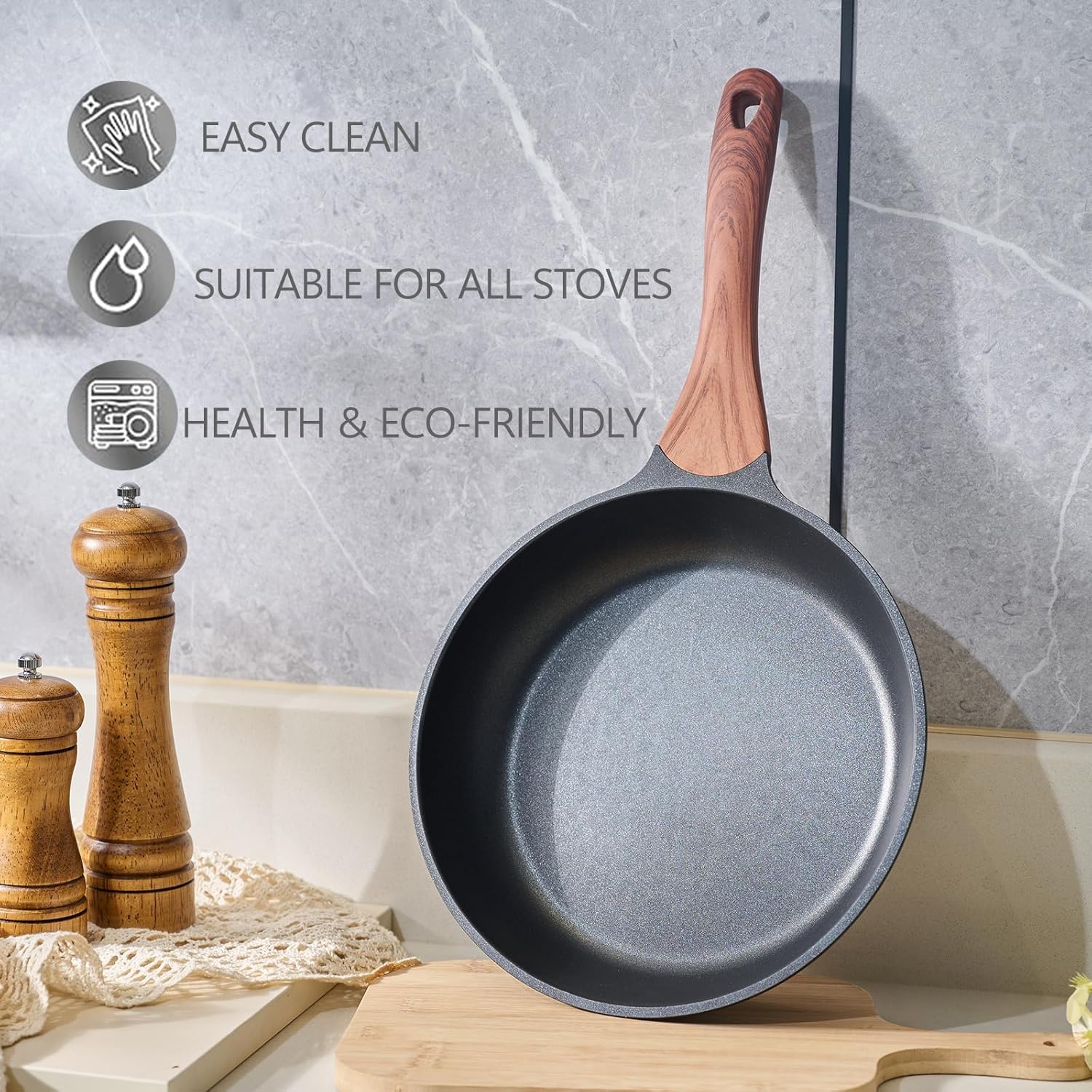 - 【Easy to Clean & Eco-friendly】Also, you'll be able to cook healthier meals for your family since you won't have to use as much oil. Clean up is a breeze, just wipe it with a rag or rinse with water. Dishwasher safe,hand washing recommended to preserve the nonstick. The nonstick surface makes cooking with little oil for healthy diet, the pan can help you solve stick and difficult to clear problem. CO2 emissions can be reduced. This frying pans for stove top is ECO Friendly.