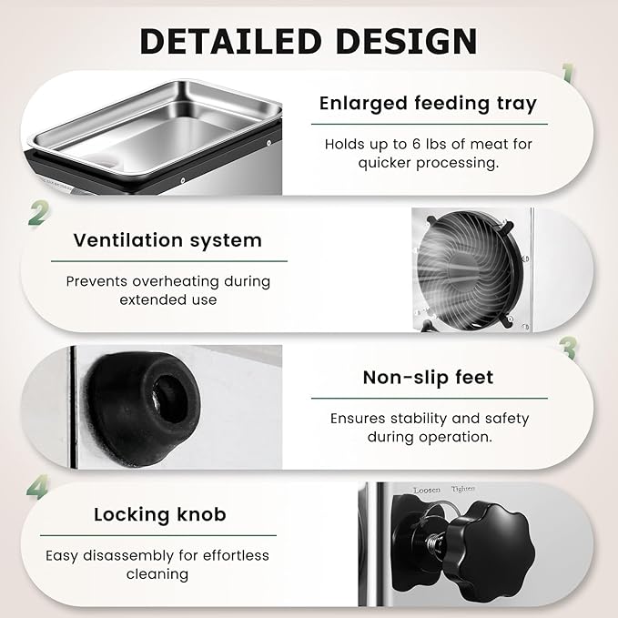 - [Detailed design]1. The enlarged feeding tray of this professional meat grinder holds up to 6 lbs of meat, allowing for faster processing. 2. The ventilation system prevents overheating during extended use, ensuring longer operation without losing performance. 3. Non-slip feet enhance safety by preventing sliding during operation. 4. A locking knob makes assembly and disassembly quick and easy for effortless cleaning