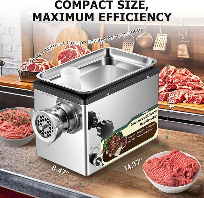 - [Powerful performance] This electric meat grinder features a powerful 1100W motor, capable of grinding up to 3.3 lbs of meat per minute. This heavy-duty grinder is built for efficiency and durability, making it ideal for restaurants, butcher shops, and commercial kitchens