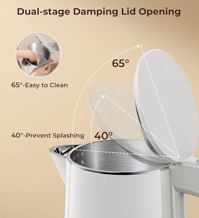 - 【Dual-stage Damping Lid Opening】Press the button of the electric kettle to open the lid to 40° to avoid hot water splashing or steam. Rise the lid to 65° for easy filling and cleaning.